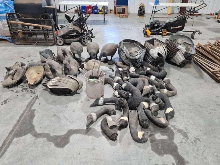 Waterfowl hunting decoys, including full-bodied plastic molded decoys and detachable headpieces. Some decoys are painted or unpainted, with varying degrees of wear, use, and possible damage. Approximately 37 bodies, 40 heads, 33 smaller sized bodies and heads, plus bucker of assorted heads