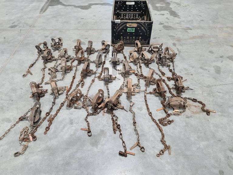 Approximately (30) Steel animal traps featuring chains of various lengths, along with a black crate for storage. Includes models such as Duke traps (visible markings on some items).