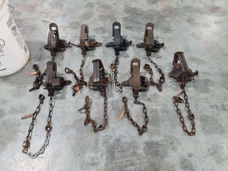 Metal animal traps with springs and chains, including 8 traps. Chains are attached to each trap, some feature anchoring components. Bucket is included