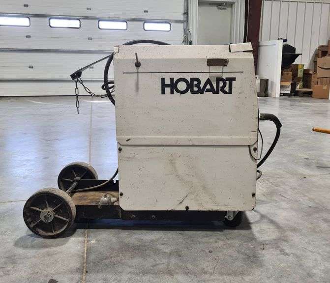 Hobart Beta-MIG 170 wire feeder welding machine. Includes built-in controls for wire feed speed and voltage adjustment. Features a 4-wheel base for mobility and power cord with plug attached. Housing includes internal spool compartment and operational instructions panel.