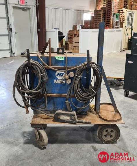 Miller Millermatic 200 welding machine featuring constant potential DC arc welding power source and integrated wire feeder system. Includes attached cables, welding gun, gauges, and mounted wire spool. Unit is mounted on a sturdy rolling cart for mobility.