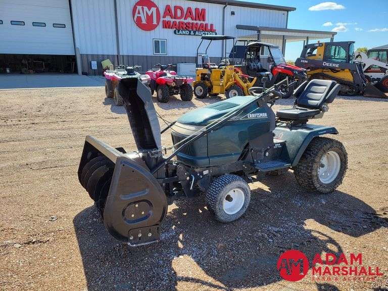 Hydrostatic Transmission, Kohler 20HP Gas Engine, No Hours Showing, Craftsman 2-Stage Front Mount Snow Blower, Manual Chute Control, 4FT Cutting Width, Tire Chains, 23x10.00-12 Rear Drive Tires, 16x6.50-8 Front Steer Tires