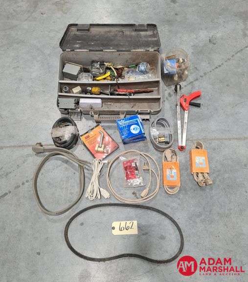 A plastic toolbox containing an assortment of electrical tools, hardware, and accessories. Included are various cables, outlet extenders, power cords, cutters, plugs, and connectors. Additionally, the lot includes a handsaw, belts, and general repair components.