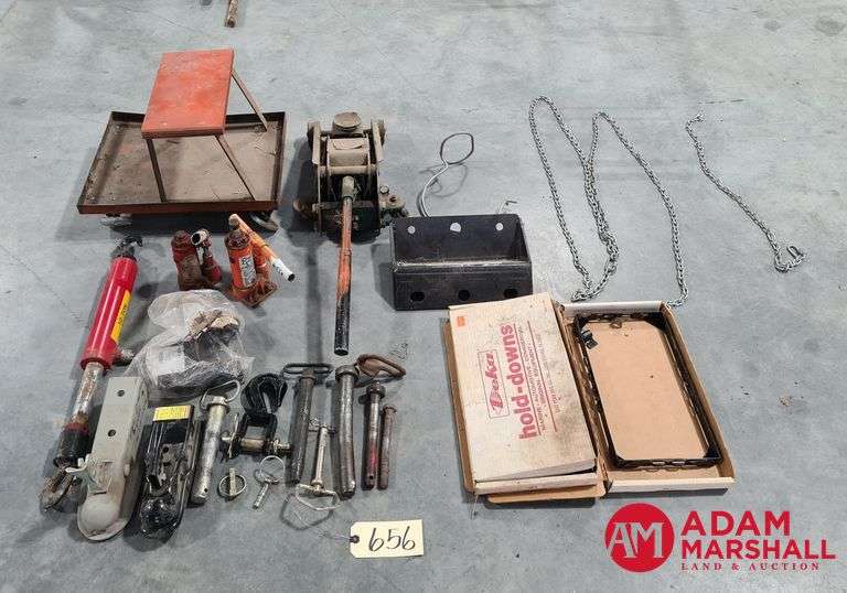A variety of automotive and mechanical tools, including hydraulic bottle jacks (2-ton and 10-ton capacities), a 10-ton pull-back ram, a rolling metal creeper, manual hand tools such as hitch pins, hooks, and brackets, a Shelton jack saddle block, chains, and a box of Fischer hold-down brackets.