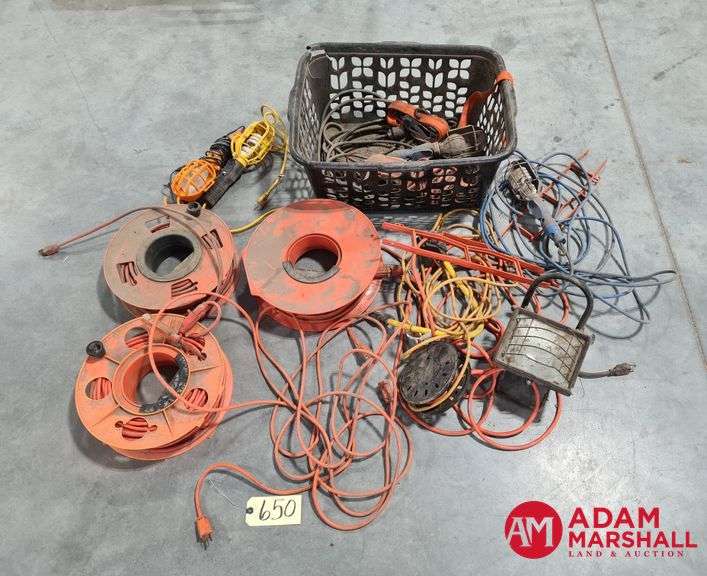 Collection includes multiple extension cords of varying lengths, three red cable reels, portable work lights with protective casing, and additional electrical equipment stored in a black plastic crate.