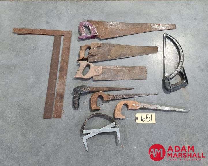 A collection including four traditional hand saws with wooden and one painted handle, (2) carpenter’s squares, two coping saws with curved handles, and a hacksaw with a metal frame and replaceable blade.