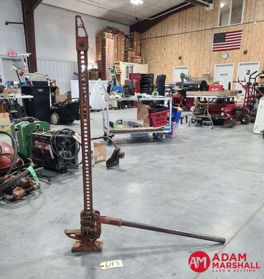 Hi-Lift all-cast jack featuring a perforated steel upright column and a cast iron lifting mechanism with a lever handle. Approximate height of the jack exceeds 4 feet.