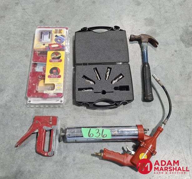 A selection of tools including: a red heavy-duty manual stapler, an air-powered grease gun by Northern Tool, a claw hammer with a rubberized handle, a 5-piece Drillco annular cutter kit with labeled hard case containing multiple sizes of metal cutters, and a Milescraft hinge mortise kit with original packaging and components.