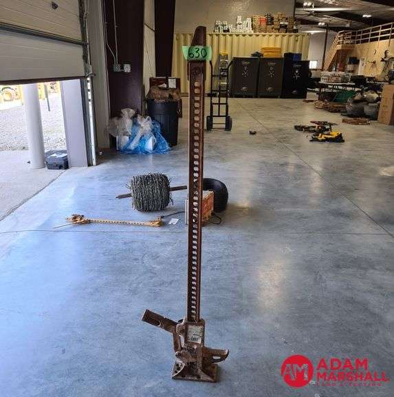A manually operated high-lift farm jack. Features a perforated vertical bar with an adjustable mechanism designed for lifting heavy loads. Measures approximately 48-54 inches in height.