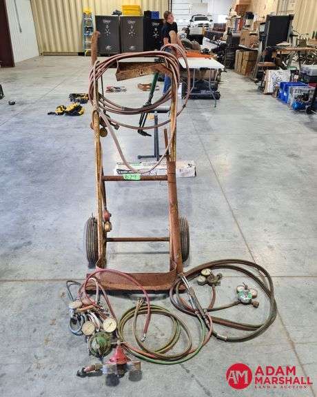 Welding cart constructed of metal with dual large rubber wheels for mobility. Includes multiple gas regulators, hoses, and gauges attached to and stored on the cart. Suitable for welding setups requiring gas control equipment.