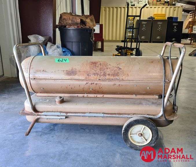 Ace portable space heater featuring a steel tank and chassis mounted on two wheels with a supporting base. Equipped with a handle for mobility and a visible motor assembly. The manufacturer label indicates Model No. IR-65T and Serial No. 55228. Designed for fuel-based operation as outlined on the label.