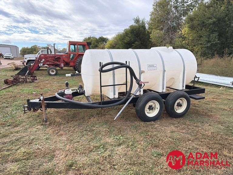 Tandem Axle, Spring Suspension, Pin Hitch, Jack Stand, Honda GX120 Pull Rope Start Gasoline Engine w/ Pump, Banjo Valves, 1025 Gallon Poly Snyder Tank, 11L-15SL Tires, No Title, CK2237