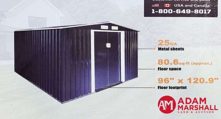 Assembled Size 100" X 124.8" X 71", 80.6 Sq Ft, 25 GA Metal Sheets, 24 GA Support Frame, W/4 Air Vents - Self-Tap Screw-Together Assembly, All Assembly Hardware Included